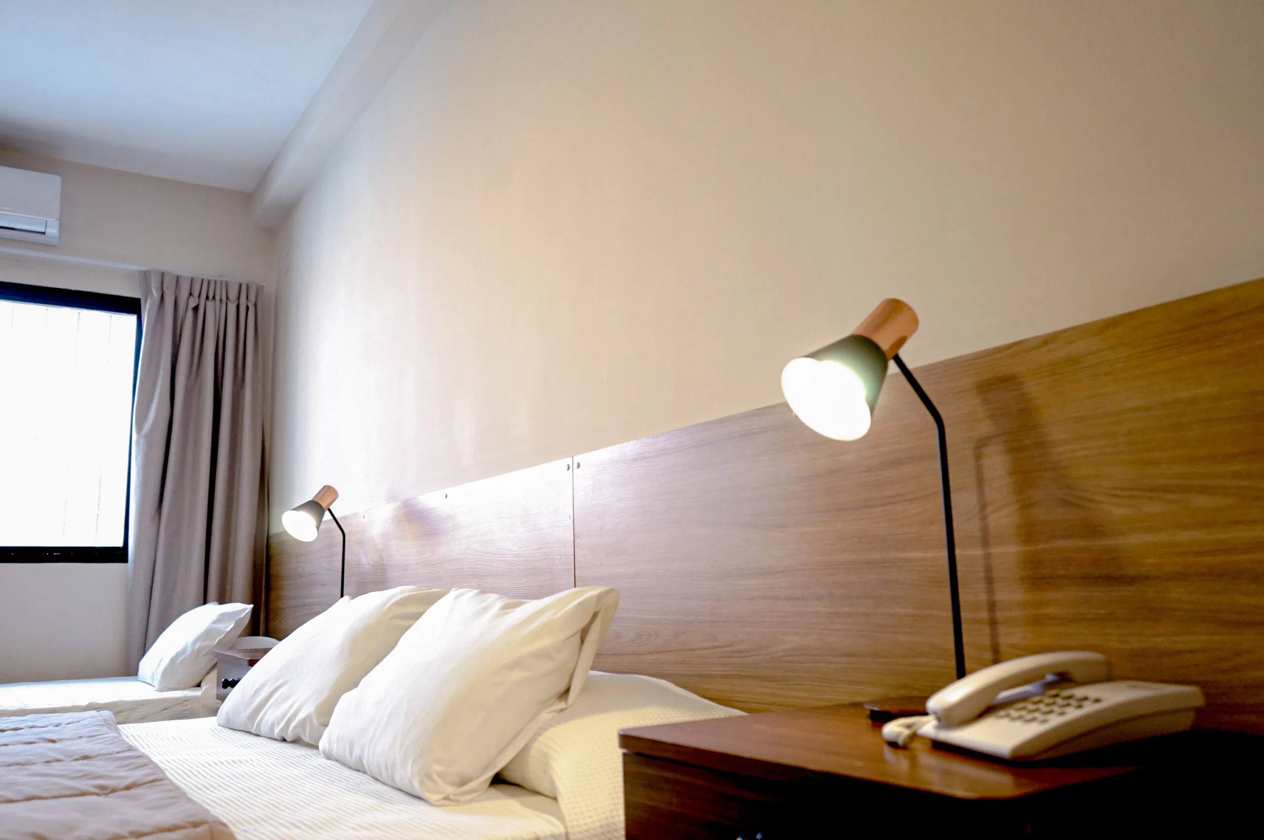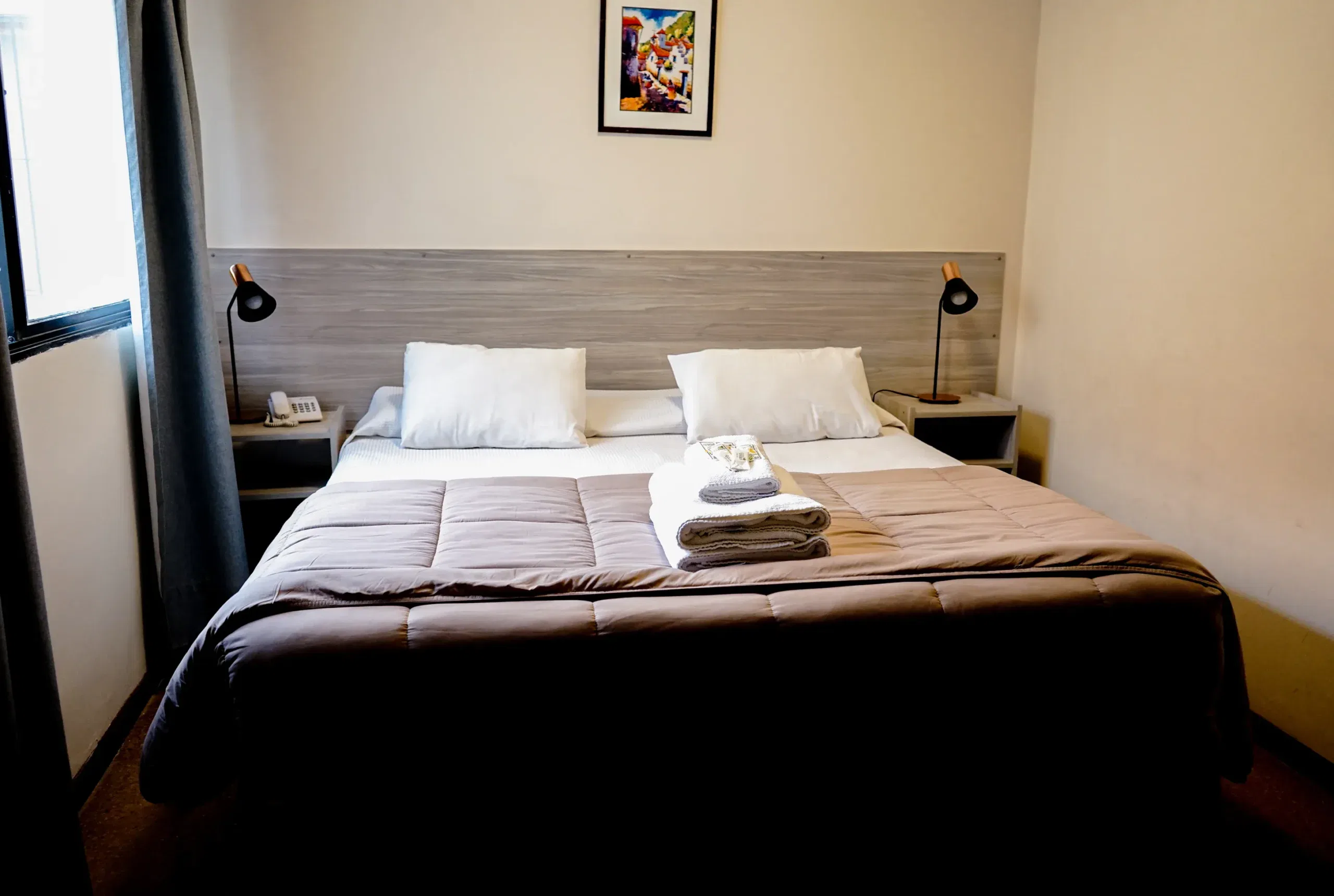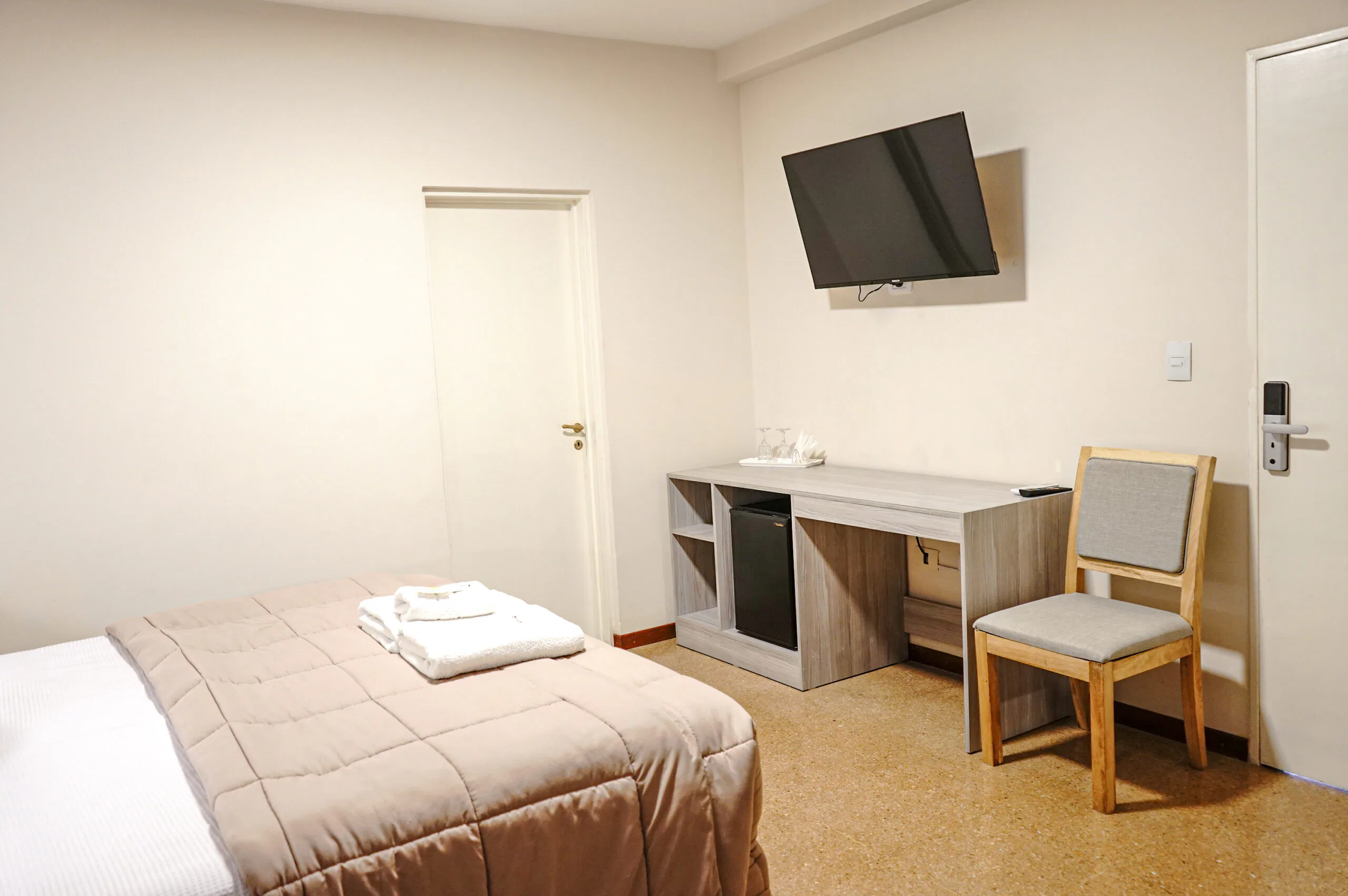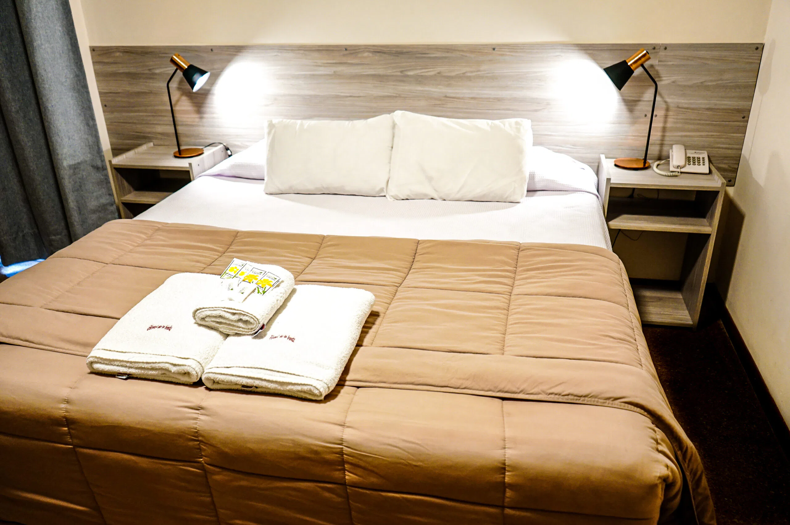 Esta habitación doble, amplia, cuenta con aire acondicionado frio/calor, TV de pantalla plana smart tv por cable y baño privado. El alojamiento posee 1 cama sommier para 2 personas. Wi-Fi. Mesa de luz con lampara de noche. Baño privado. con ameneties, Ropa de Cama. Heladera frigobar, Caja de Seguridad.