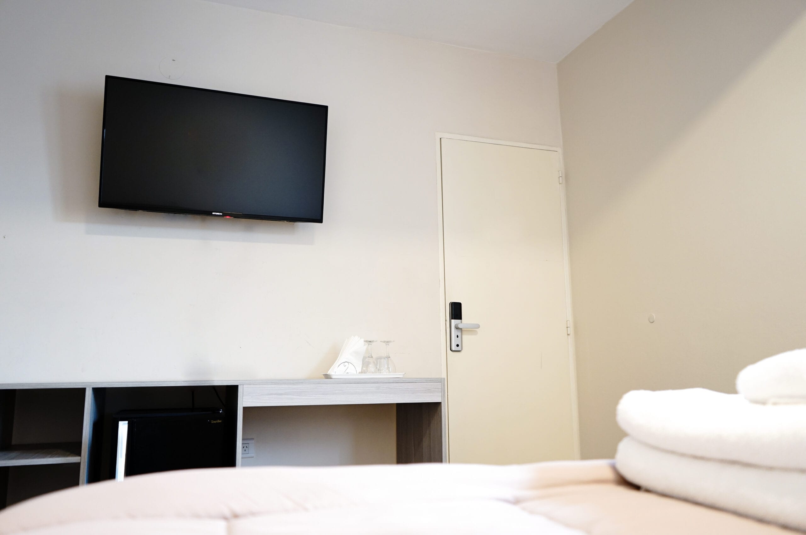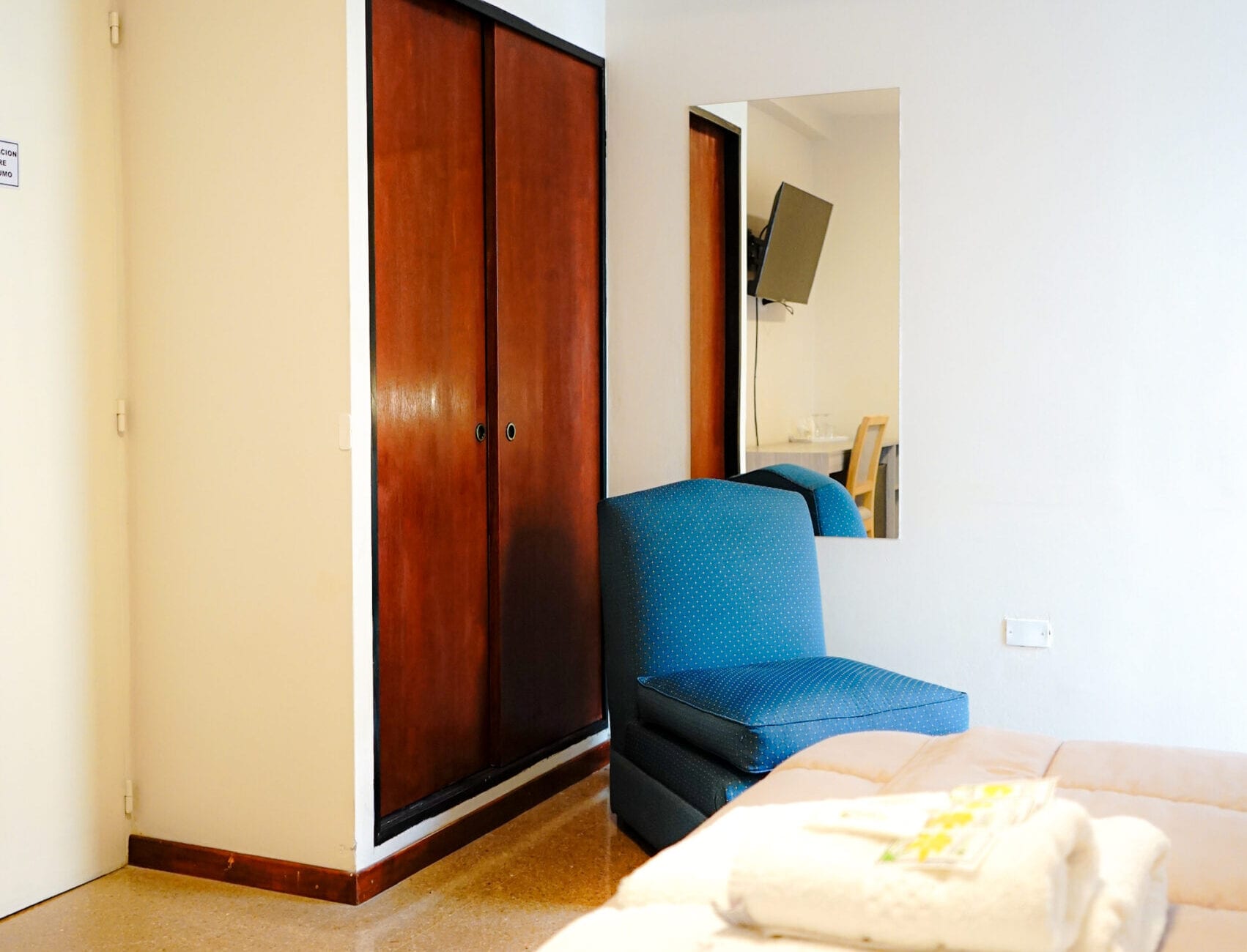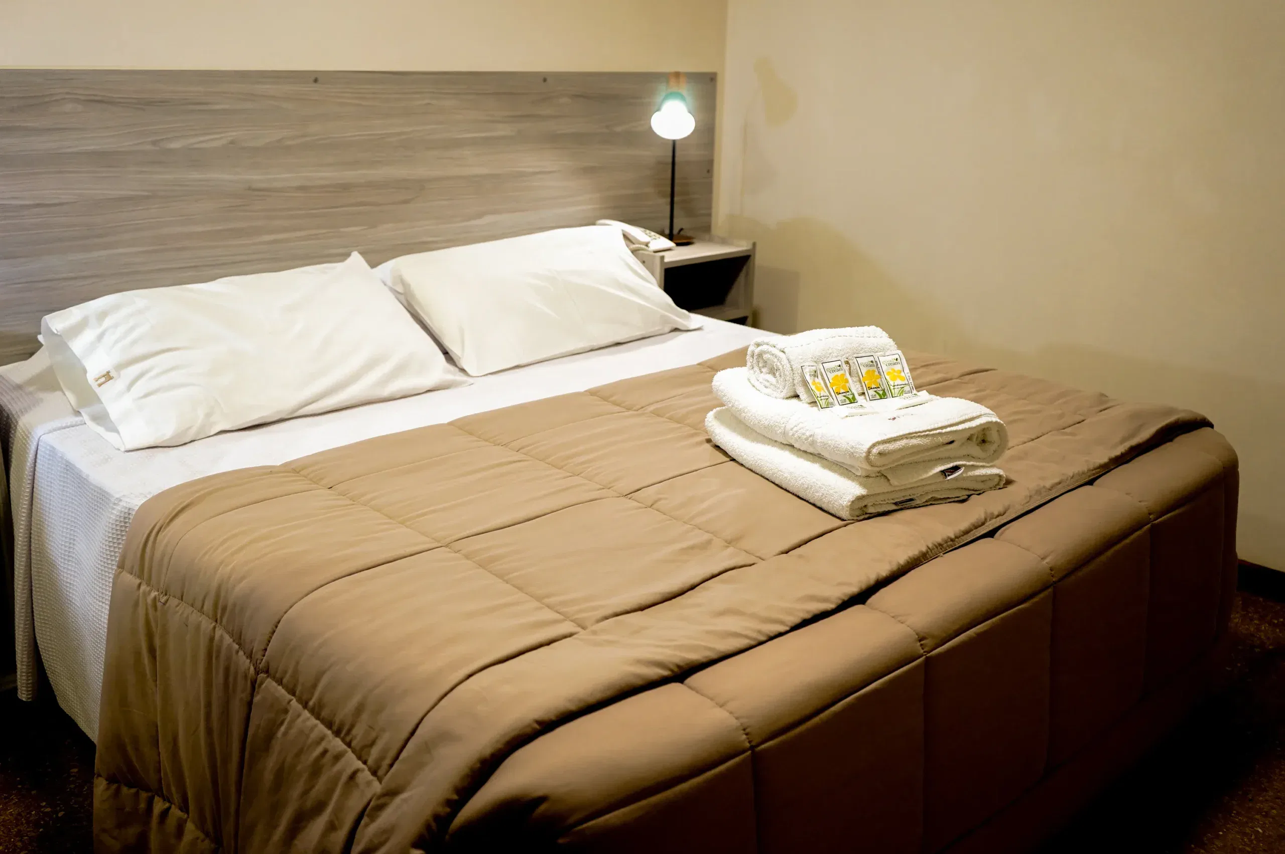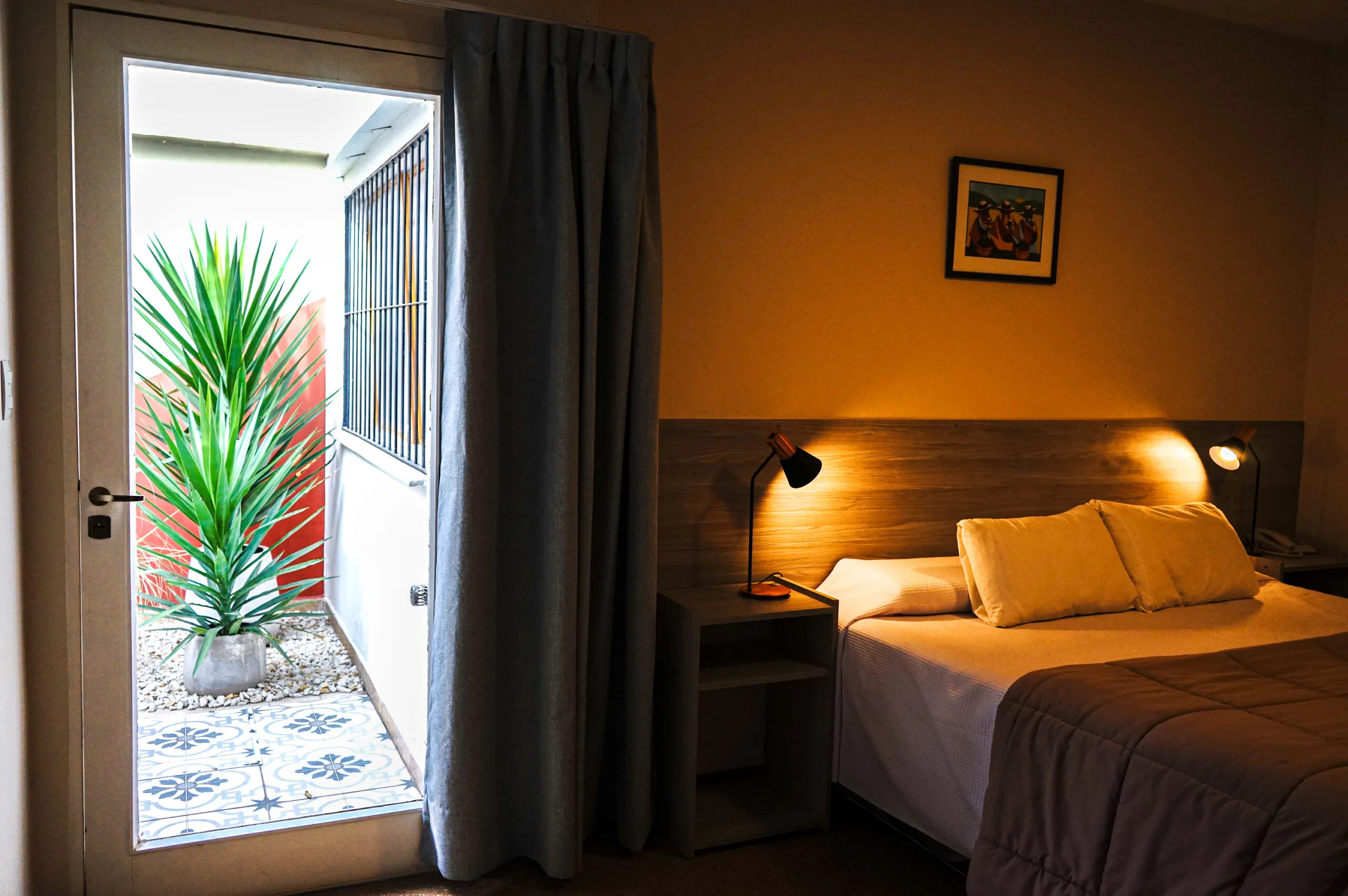 Esta habitación doble, amplia, cuenta con aire acondicionado frio/calor, TV de pantalla plana smart tv por cable y baño privado. El alojamiento posee 1 cama sommier para 2 personas. Wi-Fi. Mesa de luz con lampara de noche. Baño privado. con ameneties, Ropa de Cama. Heladera frigobar, Caja de Seguridad.